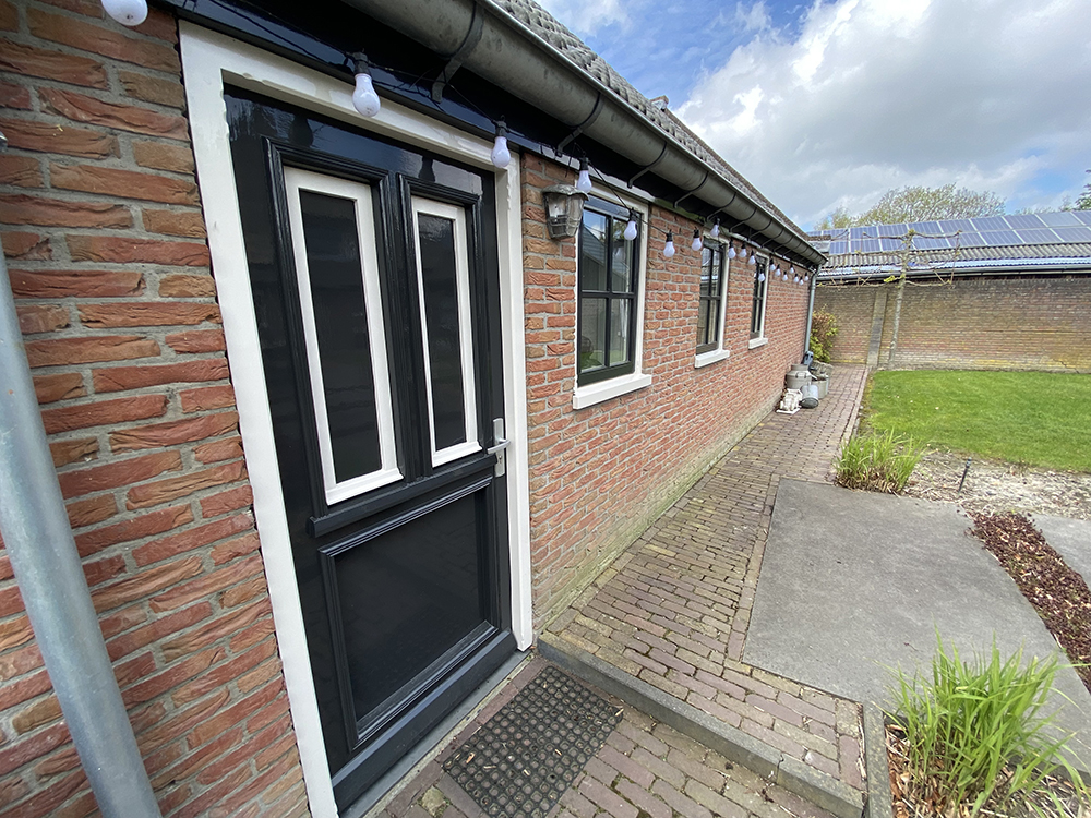 Buitenschilderwerk in lichte en antraciete kleuren.